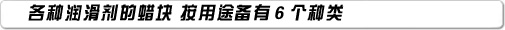 ●Bordon 蜡块 用于防止吊车铁制车轮车缘磨损。涂抹干燥蜡膜,使得灰尘垃圾无法沾粘, 从而防治机械故障的发生。 ●超级蜡块 在Bordon基础上更经一步得到改进,掺入了特制的润滑脂。形成的蜡膜稳定、 附着力强,能在第一时间消除卡住现象。 ●其他蜡块 为了节约人工降低经费,我们根据不同用途准备了多种固体润滑蜡提供挑选。